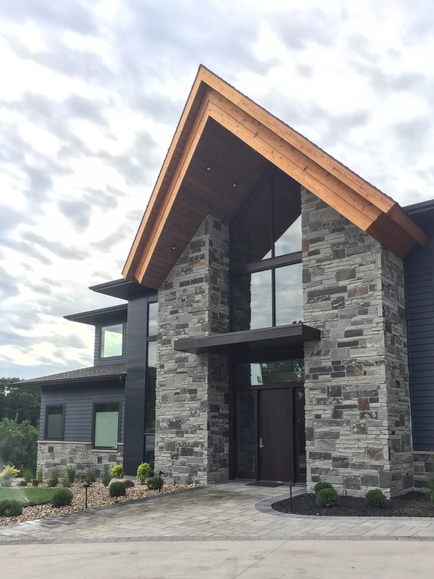 The Oak Hollow Residence is situated in the forest area near the Tomar Park neighborhood in Sioux Falls. It is perched on a hill surrounded by trees, providing a beautiful backdrop for its mountain-esque design. Upon entering the home two large stone pillars catch your eye which are continued through to the interior of the home. The open floor plan is accentuated by the high vaulted ceilings in the front entry and living room. Once in the home, you walk across a catwalk into The main level of the home has a high vaulted ceiling and an open floor plan. This level includes the primary suite wing, great room, dining and kitchen, large pantry and mudroom, and a hearth room. Upstairs is the kid’s area with a craft area and study room connected by a catwalk overlooking the great room below. Also upstairs are the kids’ bedrooms, each with a unique painted accent feature. On the lower level, there are two additional guest bedrooms, a home bar, an additional living room, a music area, a playroom, an office, and a full core floor shop space beneath the garage. The exterior features multiple tile decks, both covered and uncovered. Exterior materials include a mixture of stone, artisan siding, metal paneling, and wood details.