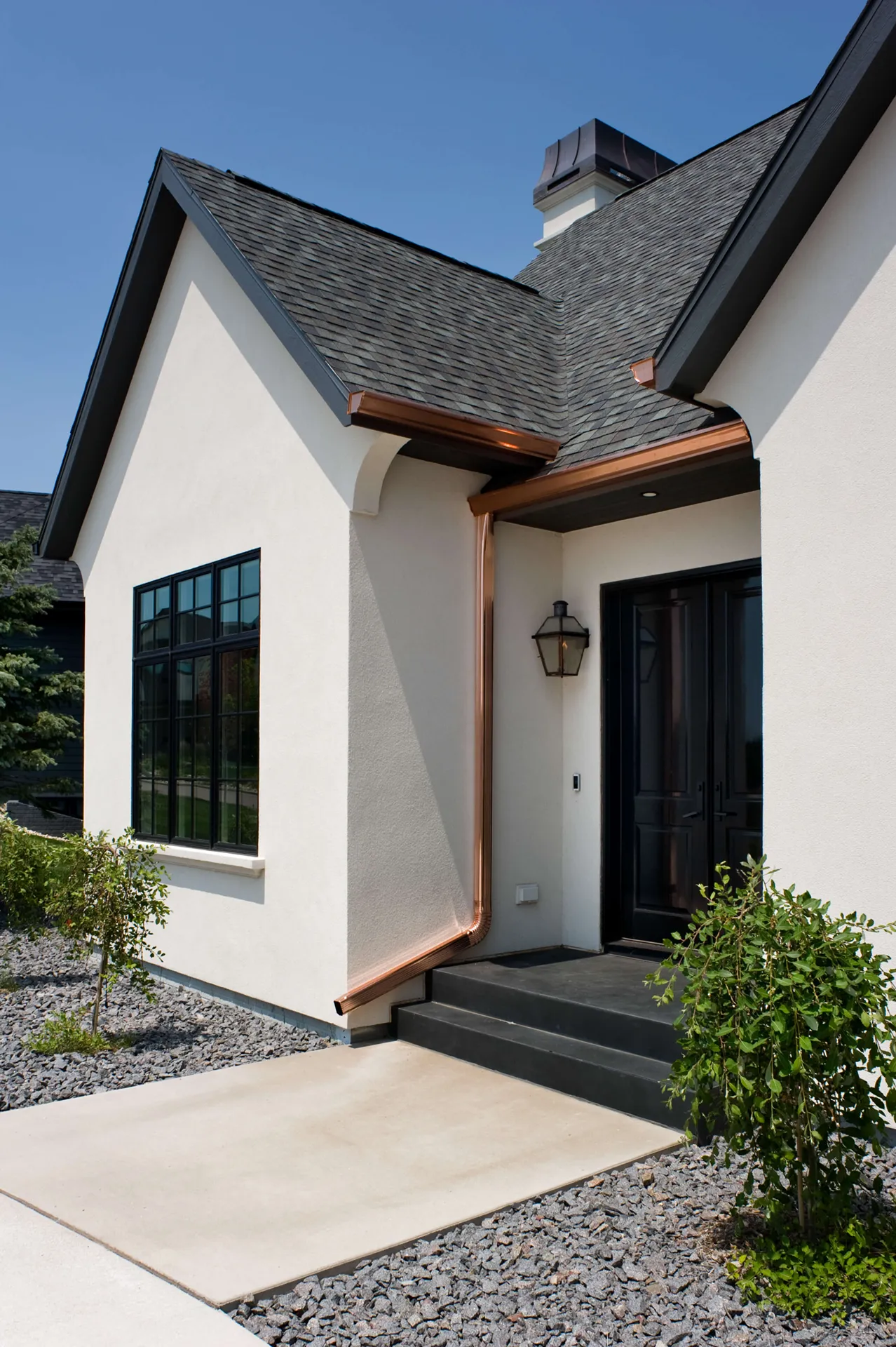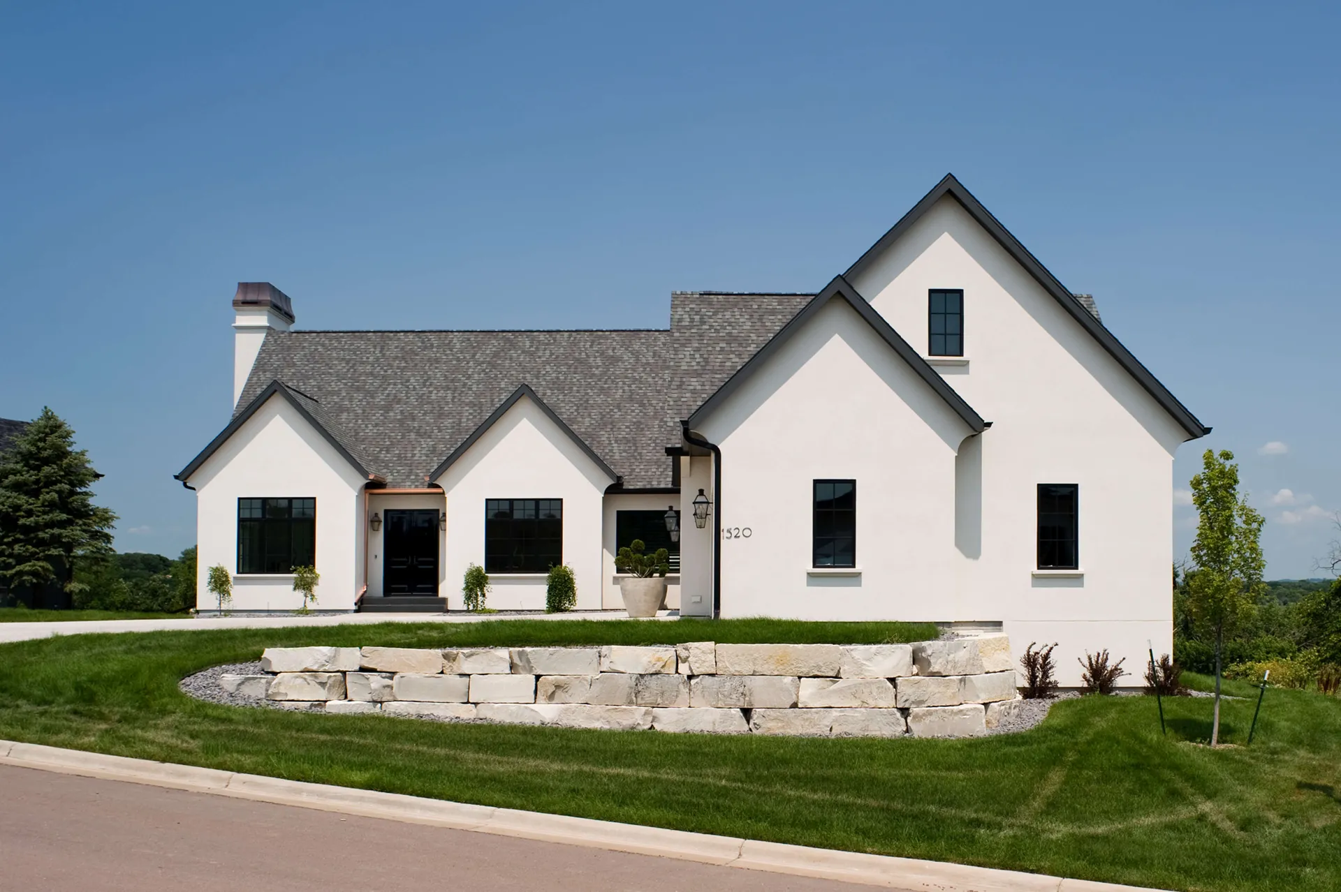 The exterior of this home showcases a Transitional French style with a custom copper chimney cap, gas lanterns, a double front door painted in piano black, and a steep roof. Throughout the house, there are various ceiling details, including a coffered ceiling in the home office and vaulted ceilings in the dining room, great room, and primary bedroom. The great room features a floor-to-ceiling limestone fireplace surround, natural timber detail, and large windows for plenty of natural light. The kitchen includes custom cabinetry, a full-height Quartzite backsplash, a large island, and a walk-in pantry. The primary suite features a freestanding tub, a large curb-less tiled shower, and a walk-in closet. Additionally, the main level includes a powder bath, mudroom, and laundry room. The wrap-around staircase with a custom stained handrail and Maple Newel posts leads to the basement. In the lower level, there are two guest bedrooms, two full bathrooms, a game room, a spacious great room with a golf simulator and a bar, and an additional home office.
